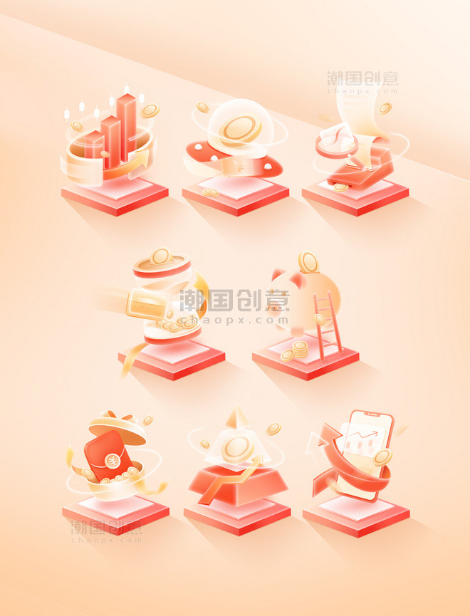 C4D商务办公金融理财投资3D立体金融理财玻璃图标设计